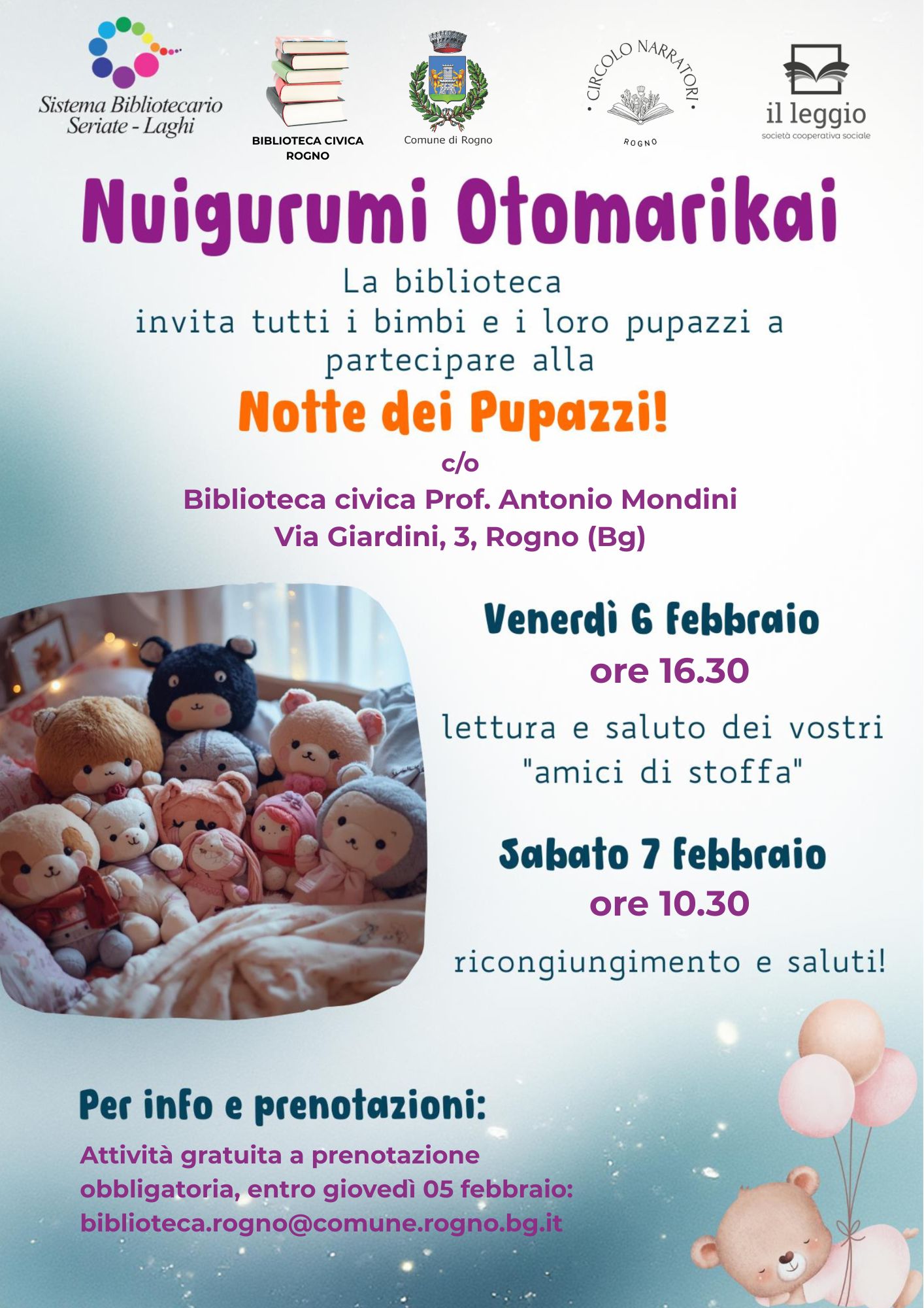 La biblioteca di Rogno organizza " la notte dei pupazzi", attività rivolta a tutti i bambini e ai loro amici pupazzi.