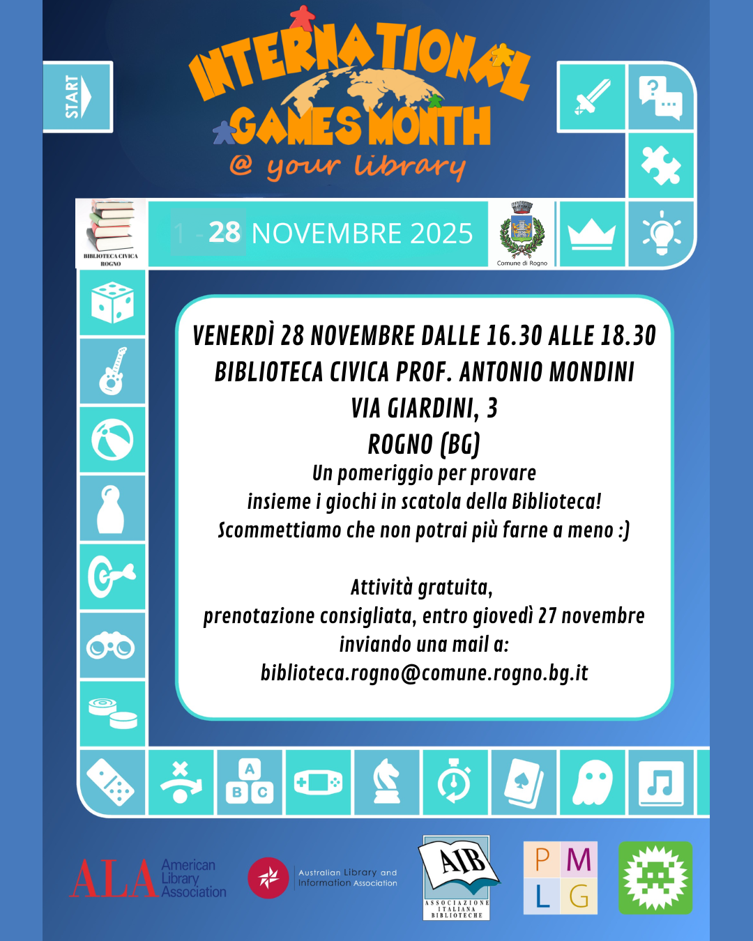 La Biblioteca Civica di Rogno organizza, in occasione dell’”International Games Day @ Your Library”, un pomeriggio di presentazione dei giochi e partite libere adatti a tutte le età.